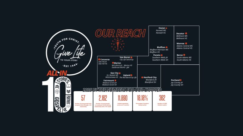 For the past 30 years, we have had the privilege to #REACHtheEVERY in our five Indiana counties. Join us as we continue the mission of AWAKENING the gospel within middle and high school students in your community. Celebrate with us the numerous amount of students over the years that built an authentic Christ-sharing relationship with us that would lead to the biggest decision of their life.